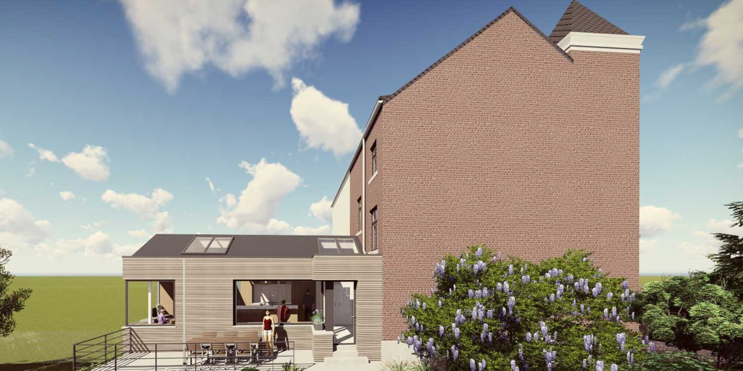 Rénovation, transformation et extension d’une habitation de ville 4 façades (cuisine, salon avec accès jardin et terrasse, chambres et salle-de-bain supplémentaires, améliorations énergétiques).