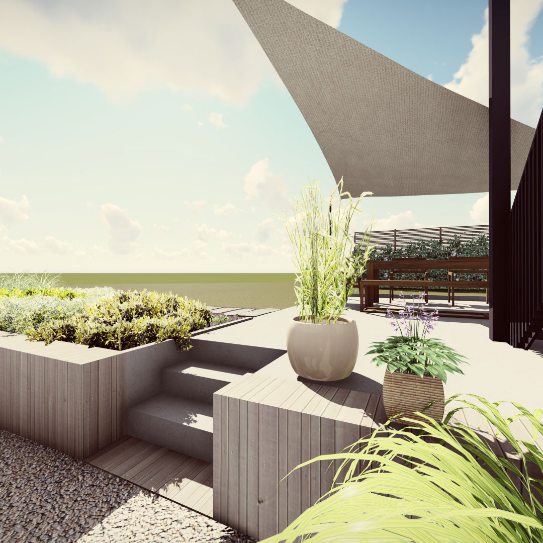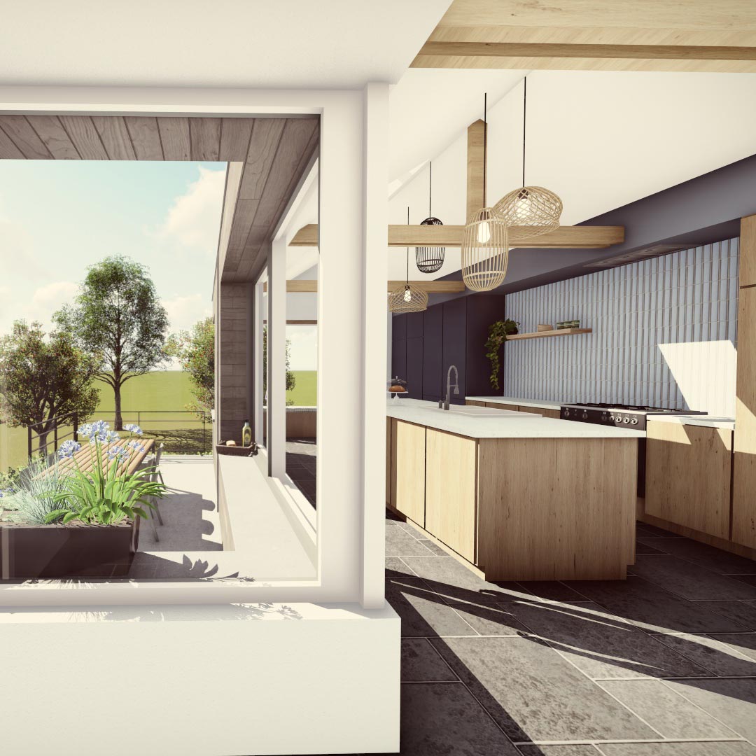 Ouverture et relation au jardin, convivialité et lumière, modernité et audace avec l’authenticité des matériaux, définition des espaces intérieurs avec un travail de volumes et de niveaux.