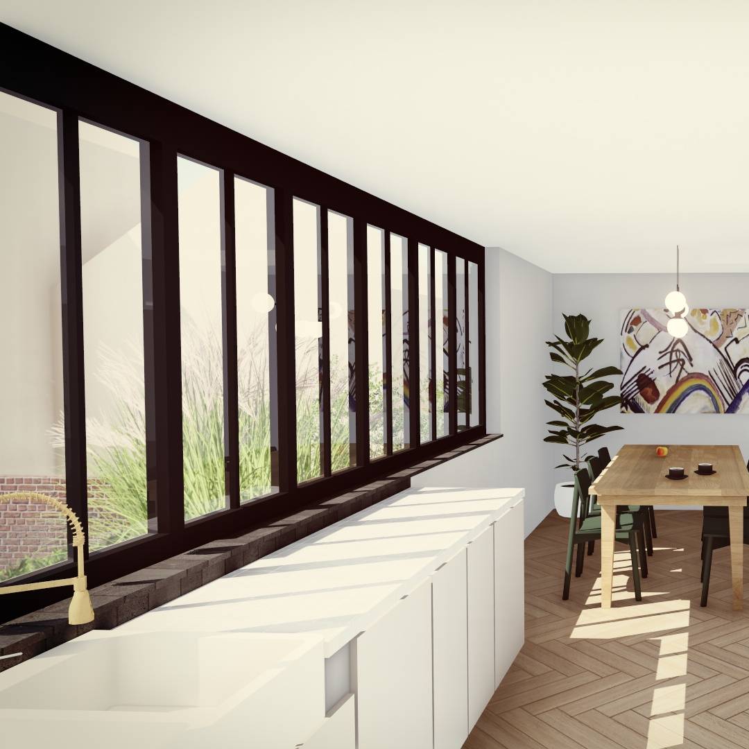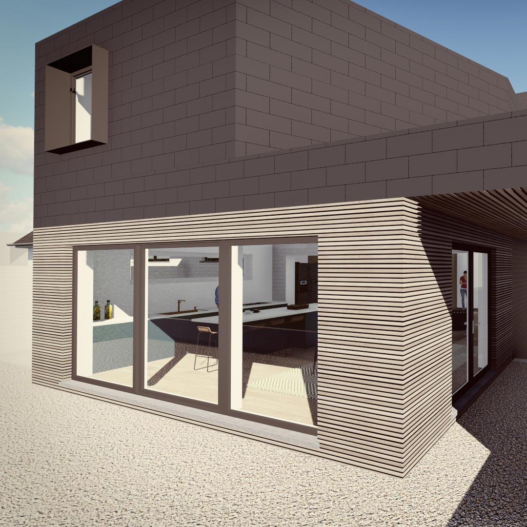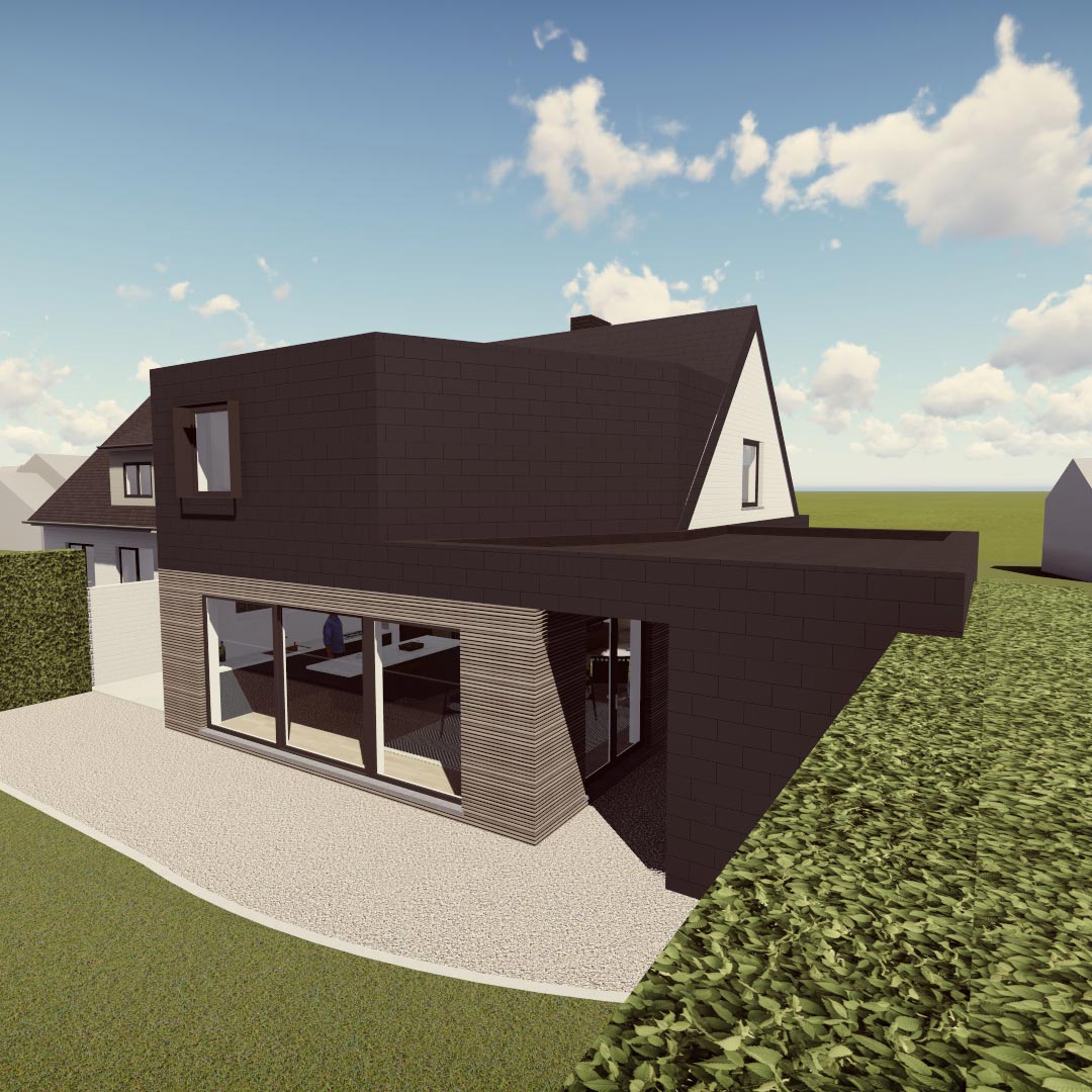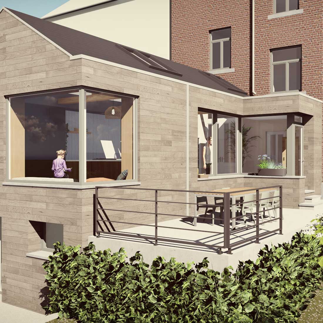 Rénovation, transformation et extension d’une habitation de ville 4 façades (cuisine, salon avec accès jardin et terrasse, chambres et salle-de-bain supplémentaires, améliorations énergétiques).