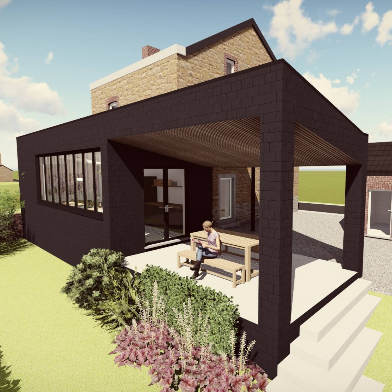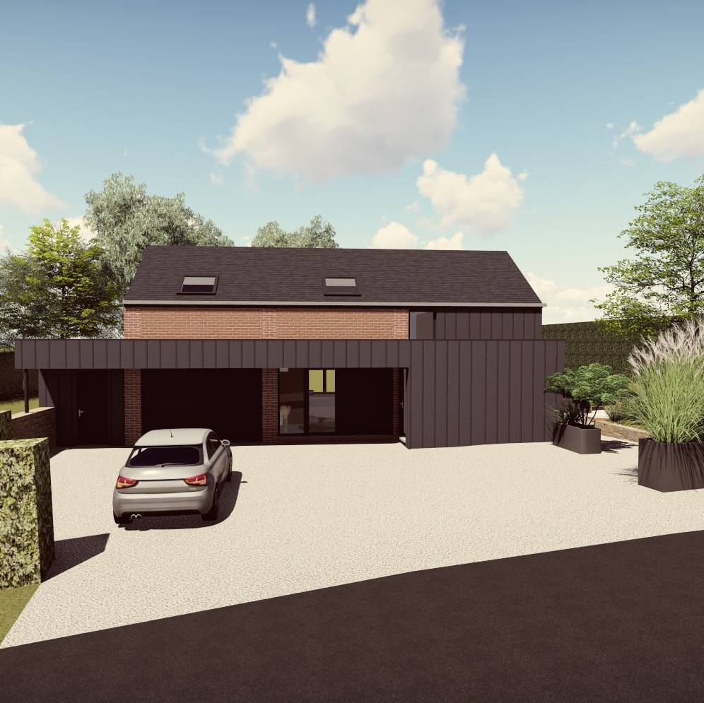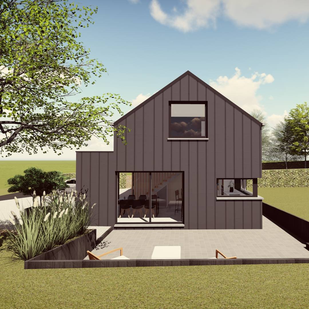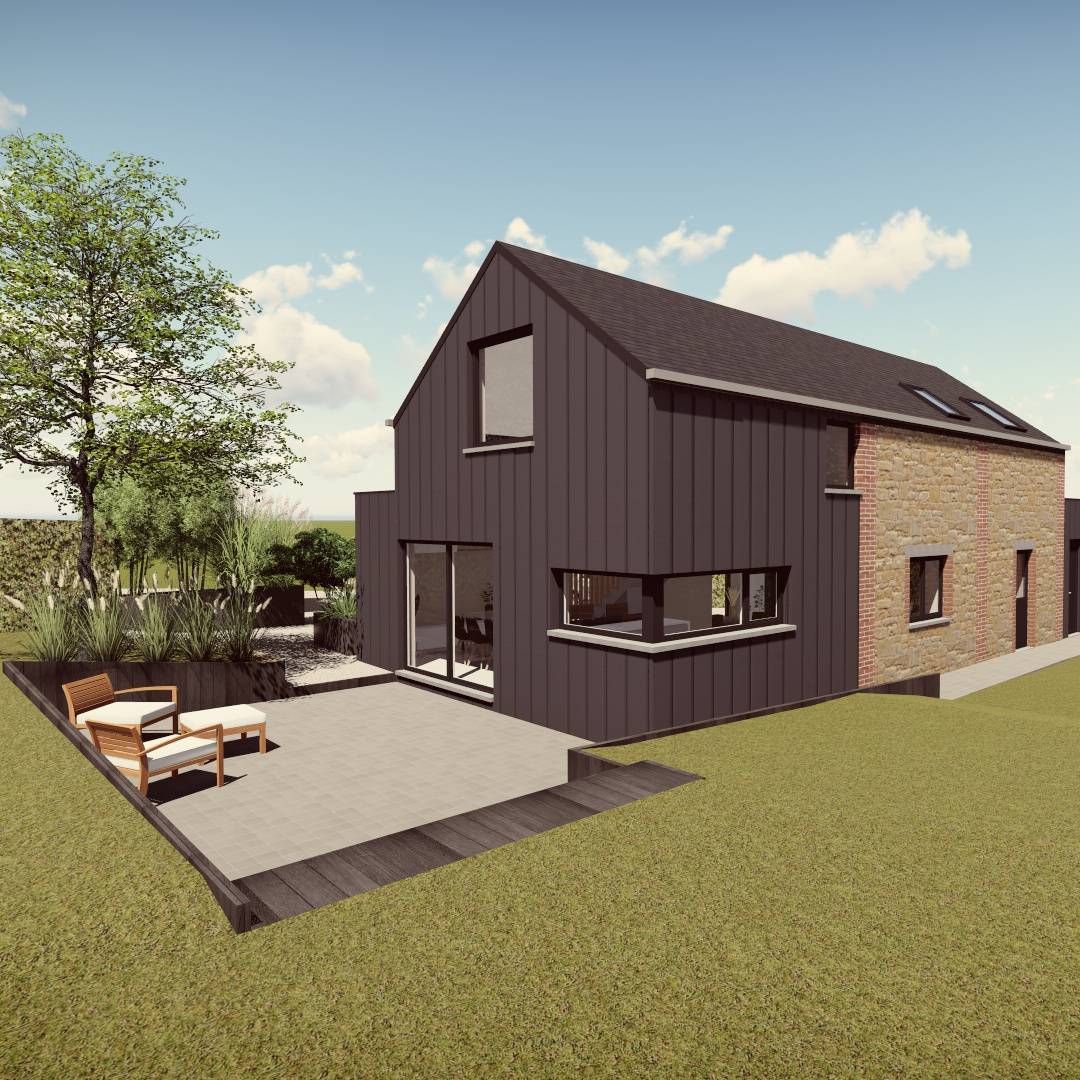 Transformation complète d’une habitation de campagne, recherche du potentiel selon l’orientation, la forme peu commune du trapèze (en plan ET en façade), les contraintes constructives existantes, l’environnement, les contraintes de budget, les besoins intérieurs, la lumière, les possibilités d’évolution.