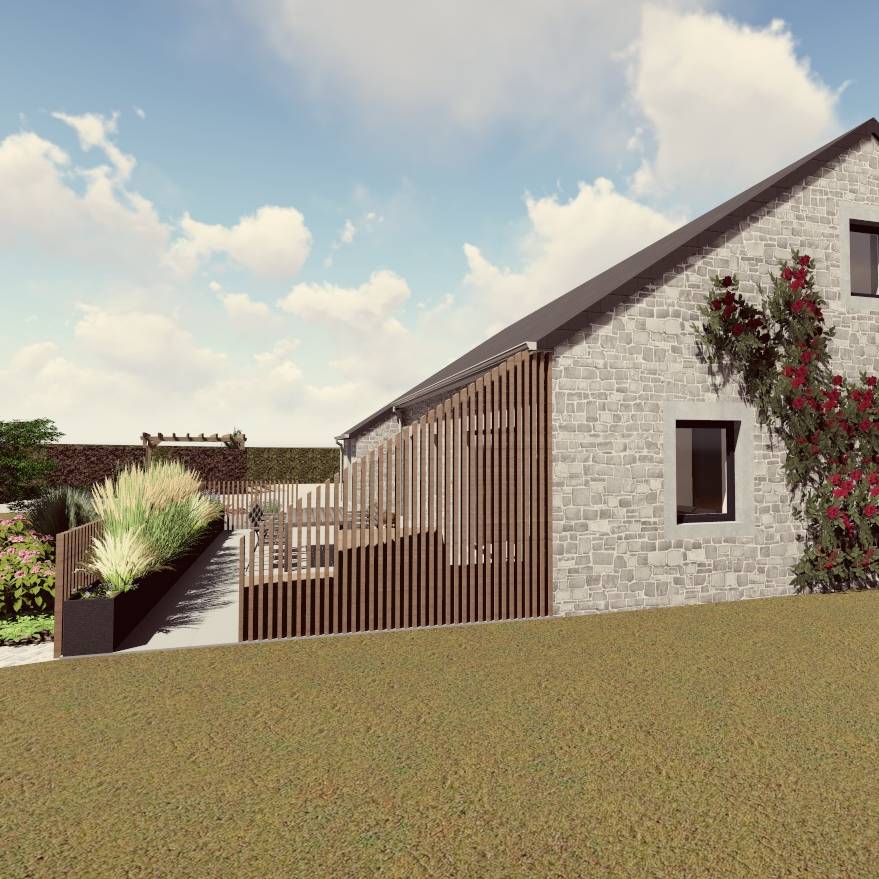 Transformation complète et extension d’une vieille habitation de campagne, ouverture et relation au jardin, mariage de l’ancien et du moderne : mise en valeur de la pierre grâce aux éléments modernes noirs (bardages, cadres de fenêtres), définition des espaces intérieurs avec un travail de volumes et un jeu de niveaux.